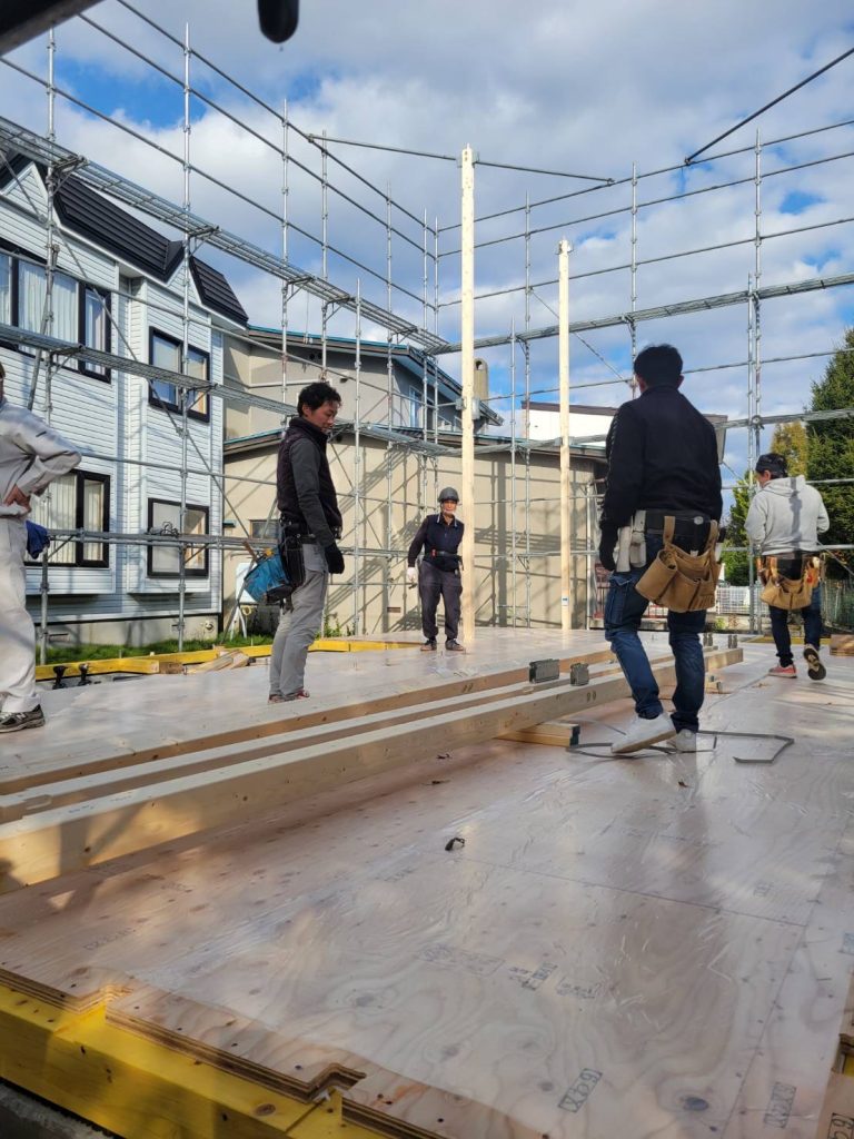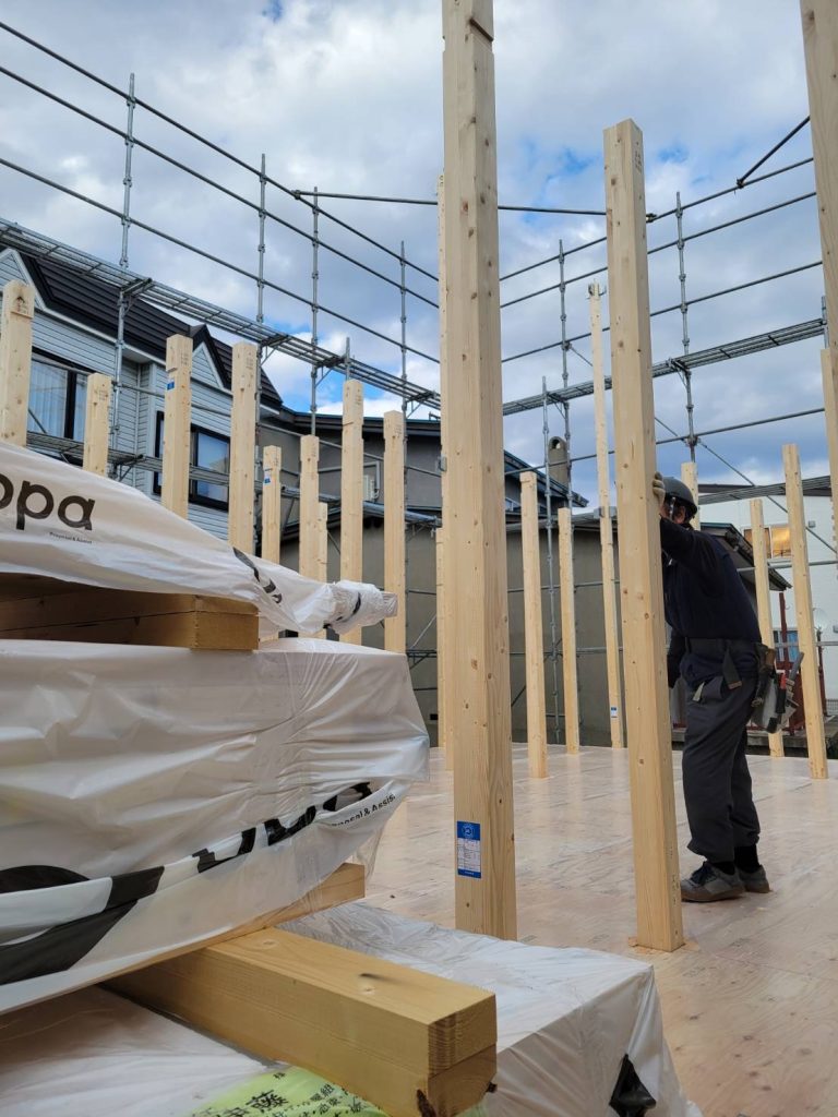 前回土台敷きまでご紹介した冨岡3丁目の家ですが、建て込みが開始されましたのでご紹介していきます。