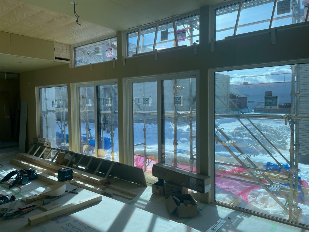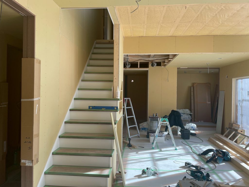 室内では、階段まわりや大きな窓のあるリビング空間などの造作工事が進行中。断熱材や配線工事も進めながら、暮らしやすさとデザイン性の両立を目指しています。