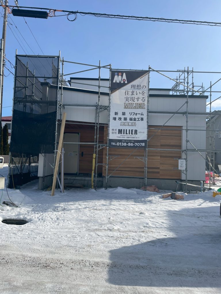株式会社MILIERです。現在、雪景色の中でも安全第一で新築工事を進めています。
